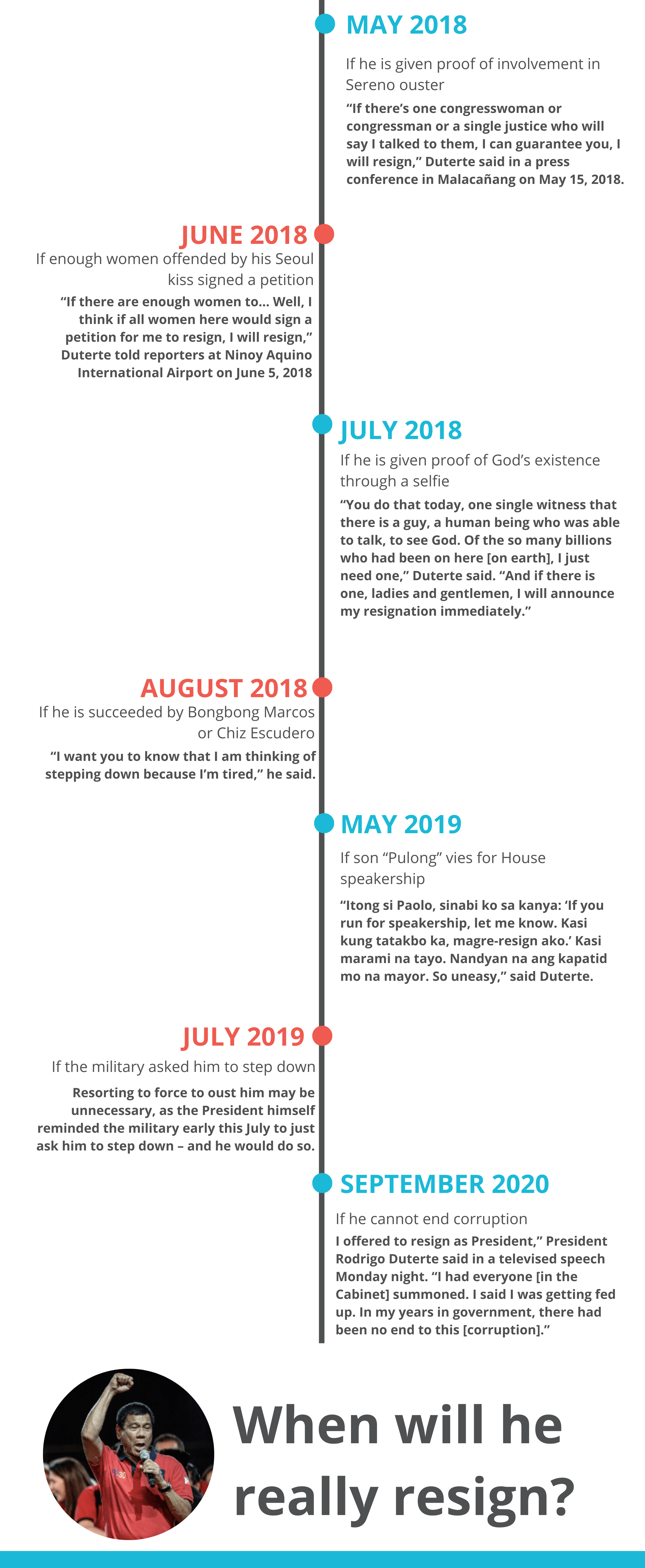 I’m writing this tired of Duterte saying he will resign. Again. He’s said this so many times but it never really happens. So I made this timeline, and I guess my favourite one was when he said he will resign if someone can send him a selfie with god. Don’t take drugs, kids.